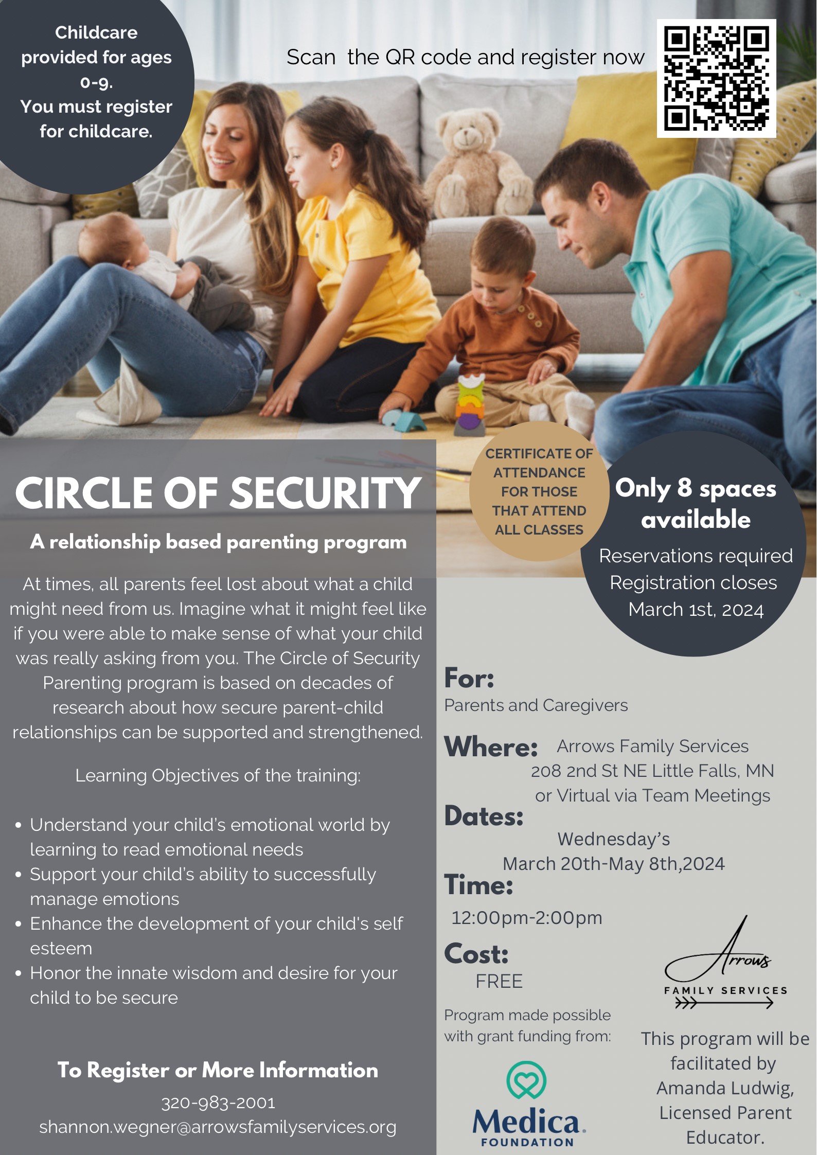 The program is being held at Arrows Family Services in Little Falls or virtual via Teams Meetings on Wednesdays, March 20th-May 8th, 2024.